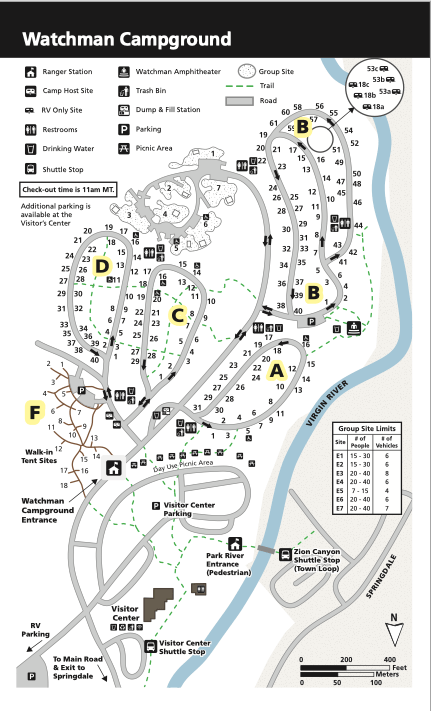 We stayed in site 54, and it was perfect, level and the door went out to the river! It was in the back of the campground off the Virgin River and we did not have horrible neighbors either. It was a pull-thru site for easy ability to take our car with us and we did not have to unhook the tow dolly.