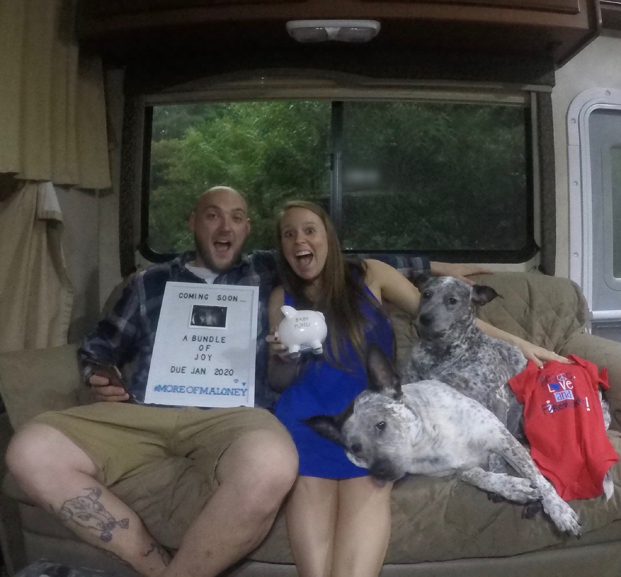 We annouced the love to our family and friends that we were pragnant July 4th 2019 with this cute photo with us and the doggies.