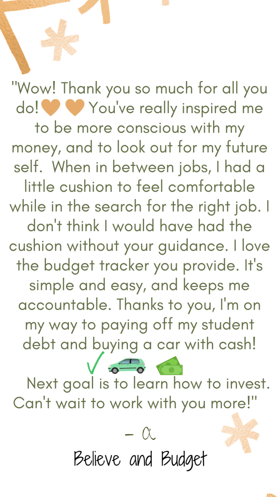 This service is a combination of my printable downloads and coaching sessions. Great for an individual who are looking to learn more or looking to improve their money.